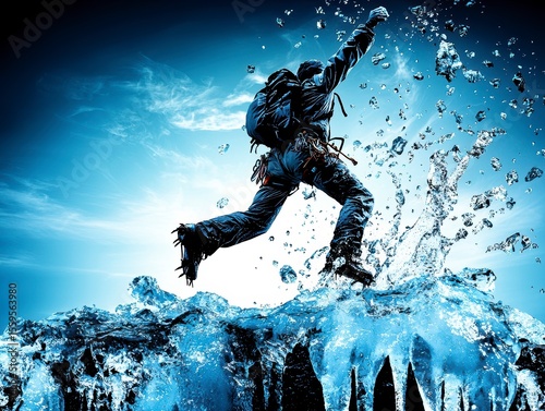 Adventurous Climber Leaping Across Icy Terrain A Thrilling Mountain Ascent