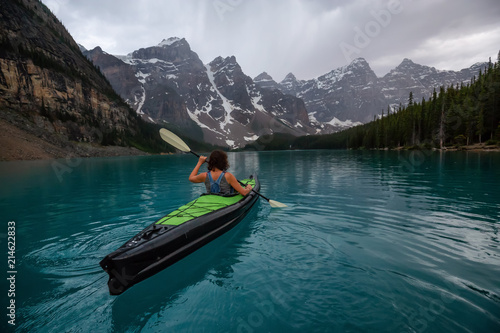 Adventurous woman kayaking in Moraine Lake during a striking cloudy sunset. Taken in Banff National Park, Alberta, Canada.