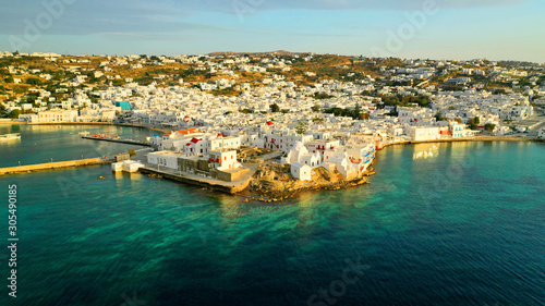 Aerial drone panoramic photo of picturesque old port in main village of Mykonos island at sunset and iconic church of Paraportiani with beautiful colours, Cyclades, Greece