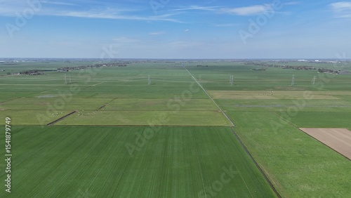 Aerial drone photo of grassland with a power line running across, 4K, Netherlands