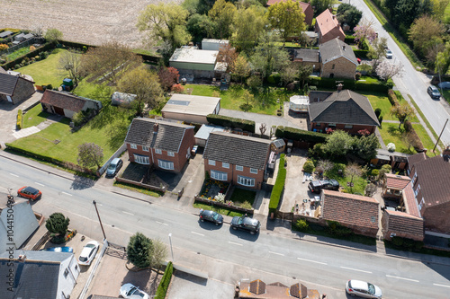 Aerial drone photo of the village of West Cowick in Goole in the East Riding of Yorkshire England showing the streets and houses and homes in the British village in the summer time