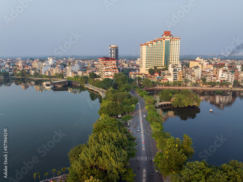 Aerial drone top view of Thanh Nien street in Ba Dinh district