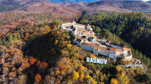 Aerial drone view of The Rasnov Fortress in Romania