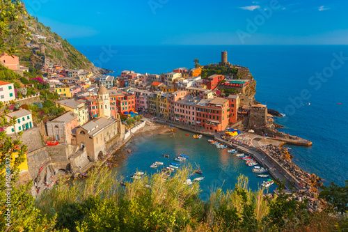 Aerial panoramic view of Vernazza fishing village in the evening, Five lands, Cinque Terre National Park, Liguria, Italy.