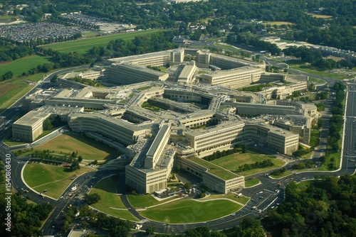 Aerial perspective of the Pentagon building surrounded by green spaces and open roads, Aerial view of the Pentagon building