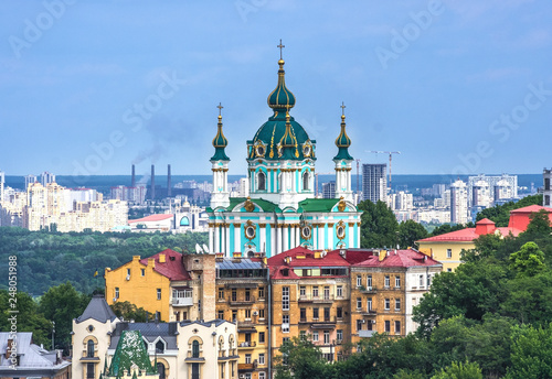 Aerial top view of Saint Andrew's church and Andreevska street from above