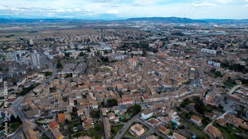 Aerial view around the old town of the city Pierrelatte in France on a cloudy day in early spring.