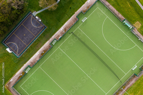 Aerial view directly above an outdoor hockey pitch and basketball court