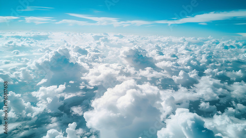Aerial view from a drone or bird's perspective above a sea of white clouds. High altitude cloudscape under a clear blue sky. Weather and travel background