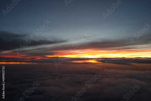 Aerial View From Airplane Window – September 5 2025: Fiery sunset over clouds seen from a plane window