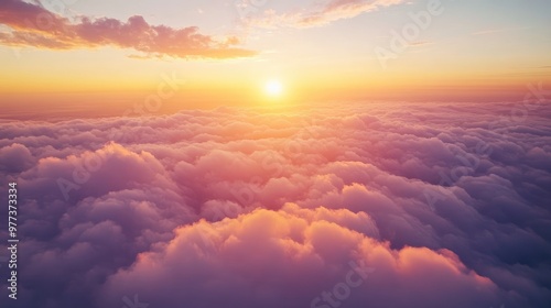 Aerial view from an airplane, flying over thick clouds during a sunrise, with warm orange and pink hues illuminating the horizon
