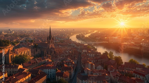 Aerial view historic city with dramatic spires piercing the skyline, iconic landmarks, golden hour lighting