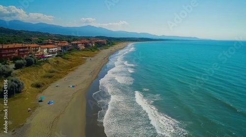 Aerial view of a beautiful coastline with buildings and mountains in background