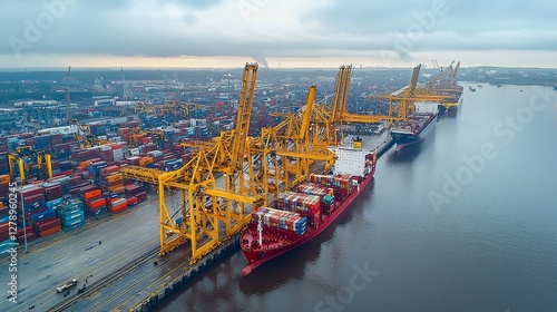 Aerial view of a busy cargo port with container ships and cranes.