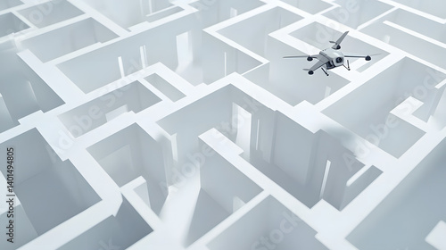 Aerial view of a drone navigating through a complex white maze, showcasing advanced technology in an abstract environment.