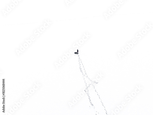 Aerial view of a lone figure cutting a dark silhouette against the stark white expanse of ice on the frozen lake, Moluvenai, Trakai district, Lithuania.