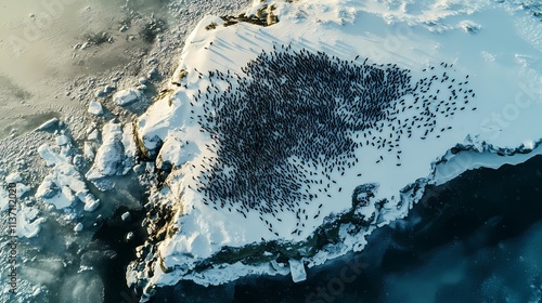 Aerial view of a massive penguin colony on a snow-covered island surrounded by icy ocean waters at sunrise.