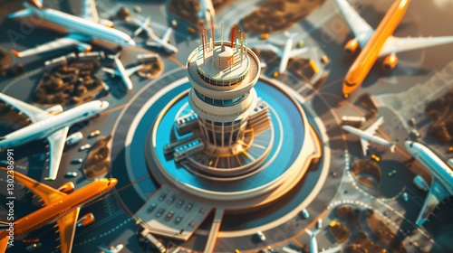 Aerial view of a modern air traffic control tower with airplanes taking off and landing on surrounding runways, showcasing aviation infrastructure and air transportation concepts.