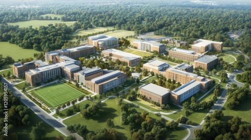 Aerial View of a Modern University Campus with Lush Green Surroundings