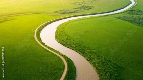 Aerial view of a significant erosion site featuring a river cutting through the landscape, bordered by a dirt road in a lush countryside setting.