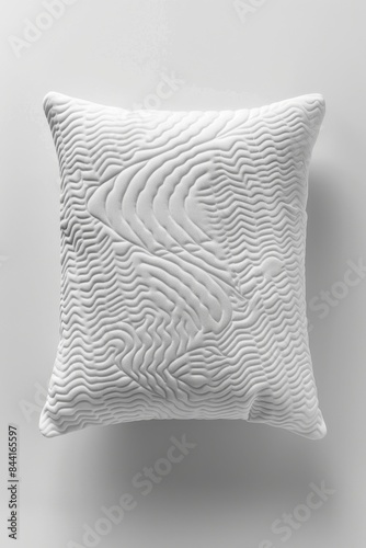 Aerial view of a stylish memory foam pillow, smooth contoured surface, crisp white fabric, subtle embossed patterns, photorealistic rendering