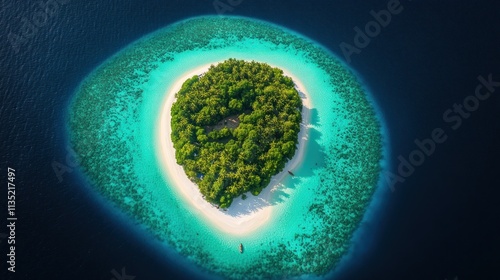Aerial view of a tropical island, ringed by turquoise water and white sand, surrounded by deep blue ocean. Lush green vegetation covers the island.