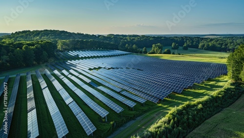 Aerial view of a vast solar farm nestled in a verdant landscape, rows of panels extending towards a tree-lined horizon under a clear sky