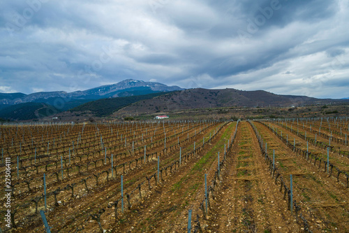 Aerial view of a vineyard during a winter cloudy day - Drone Image