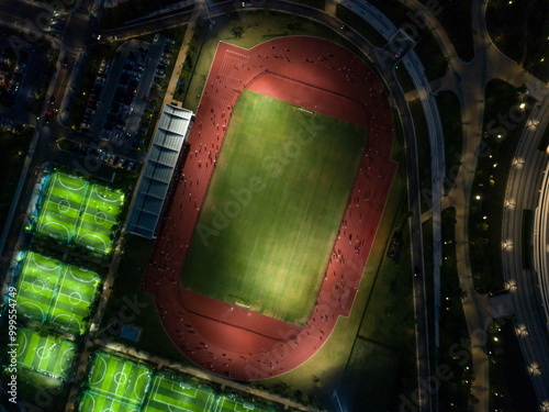 Aerial view of a well-lit sports complex at night with various fields bustling with activity in an urban setting
