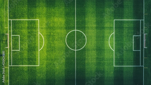Aerial view of a well-maintained soccer field, featuring two goal areas and a central circle, showcasing vibrant green grass and clear markings.