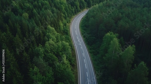 Aerial view of a winding road cutting through lush green forests showcasing nature's beauty and serenity : Generative AI