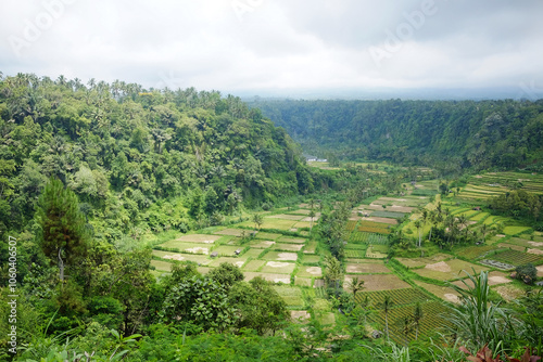 Aerial view of agriculture field and greenery paddy rice terrace in valley hill and village on mountain and forest in Bali of Indonesia. Asian destination travel