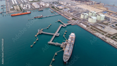 Aerial view of an LNG tanker docked at an offshore terminal with multiple pipelines, storage tanks, and an industrial complex. Captures global energy logistics