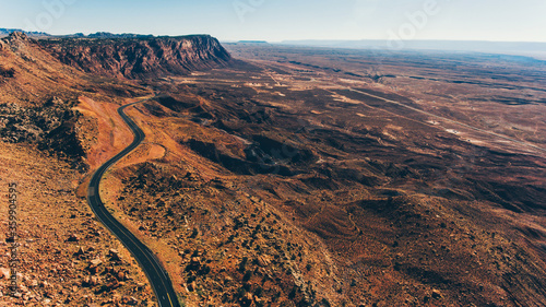 Aerial view of beautiful rocky mountain range with an asphalt road highway running along. Bird's eye scenery view red cliff in area of desert landscape of United states