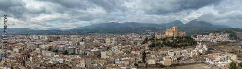 Aerial view of Caravaca de la Cruz in Murcia, southeast Spain. A major pilgrimage site dominated by Basilica Shrine of Vera Cruz with Baroque facade and medieval castle