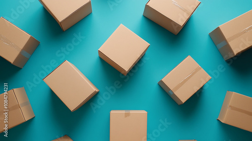 Aerial view of cardboard boxes scattered on a vibrant turquoise surface in a well-lit room