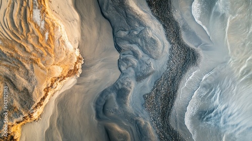 Aerial view of coastal sand patterns, ocean waves, abstract textures
