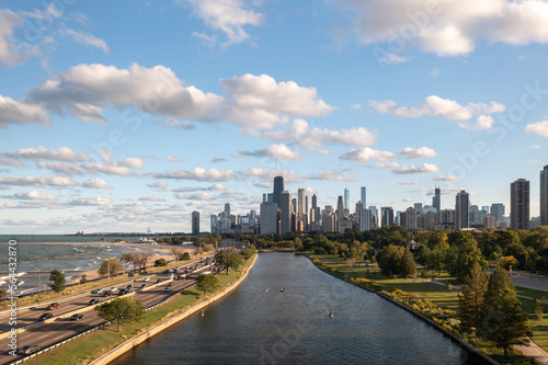 Aerial view of downtown Chicago skyline as a few people use the South Lagoon canal for boating and rowing below on a sunny day with blue sky and fluffy white cumulus clouds above.