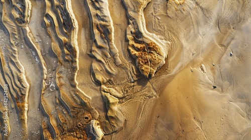 Aerial view of golden sand dunes with intricate patterns and textures, showcasing the beauty of natural formations in a desert landscape.
