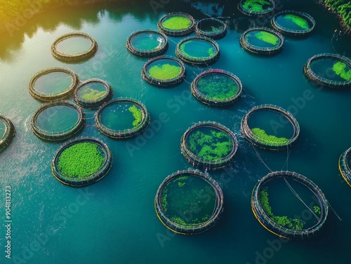 Aerial View of Green Dotted Fish Farms: An Ecosystem of Circular Ponds in Serene Waters