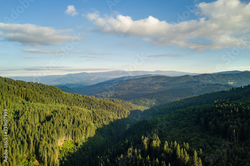 Aerial view of green mountain hills covered with evergreen spruce forest in summer.