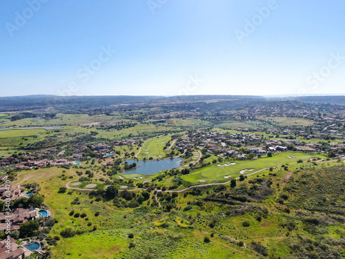Aerial view of green valley with big luxury villa on the background in a private community, San Diego, California.