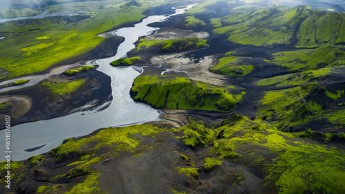 Aerial View of Iceland's Volcanic Landscape with Winding River