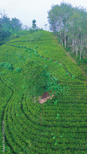 Aerial view of hills with tea plantation at misty morning in Sri Lanka Drone photo.