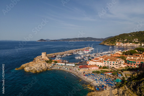 Aerial view of Marciana Marina with the harbour, Elba Island, Italy.