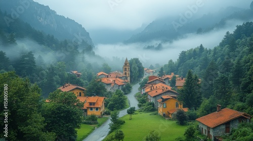 aerial view of misty village surrounded by mountains and forest infiesto asturia spain
