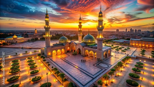 Aerial View of Mosque at Sunset During Ramadan, Islamic Lanterns
