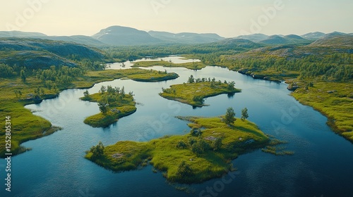 Aerial view of serene lake, islands, and mountains