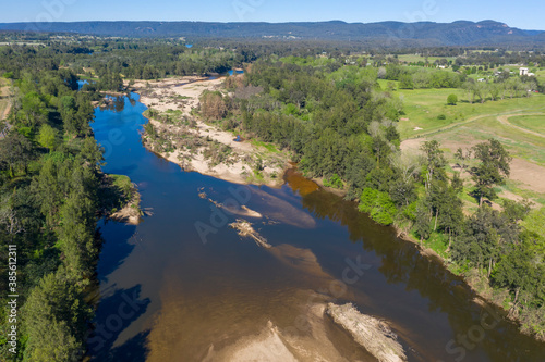 Aerial view of the Hawkesbury River and farmland in regional New South Wales in Australia