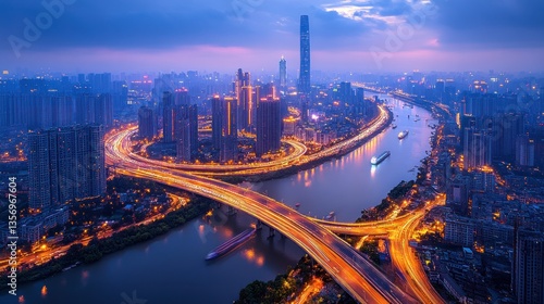 Aerial view of the illuminated city with high-rise buildings beside the river and bridge during the night reflecting light trails